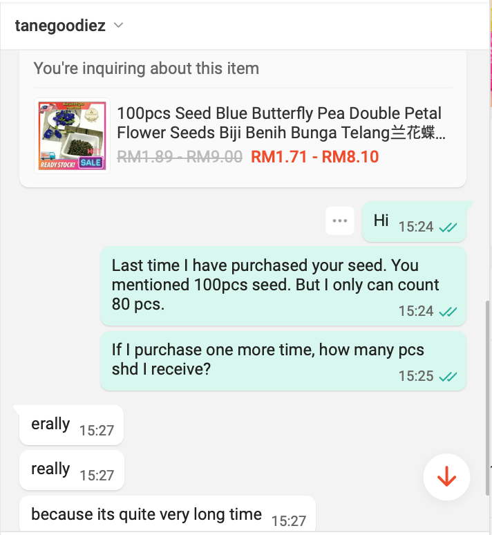 말레이시아에서 씨앗을 살때는 100개가 포장되어 있다고 광고하더니, 실제 열어보니 80개였다. 그리고 봄에 파종 했을때는 15개만이 싹이 났다. 그래서 판매자에게 항의했다.