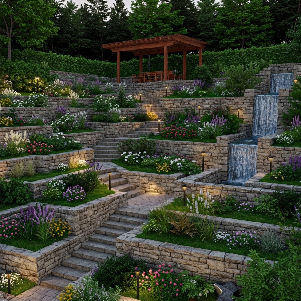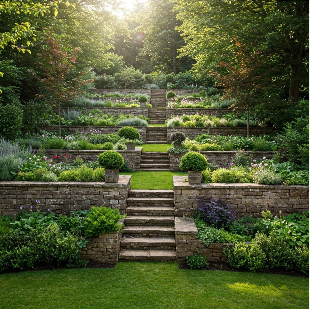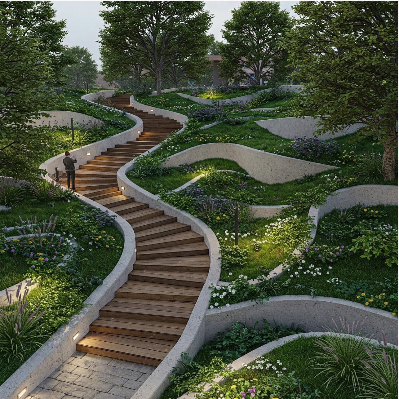 테라스 정원을 가꾼다는 것은, 각 층마다 고유한 색감과 질감, 기능이 어우러진 아름다움을 쌓아 올리는 음악을 작곡하는 것과도 같다. 적합한 배치와 돌 옹벽 시공, 수경 요소와 수직 정원 배치에 이르기까지 창조력의 폭은 거의 제한이 없다. 그늘진 아늑한 휴식 공간이나 시선을 사로잡는 예술 조형물을 곳곳에 배치해, 걷는 내내 즐거운 놀라움을 선사할 수도 있다. 반듯한 대칭형 디자인을 택하든, 자유롭고 자연스러운 구성을 선택하든, 테라스 정원은 언제나 계절과 취향에 따라 변화하는 살아 있는 작품이다. 결국 단차를 가진 테라스 정원의 진정한 매력은 형태와 기능의 조화에 있고, 단순한 경사를 평화로운 휴식처이자 멋진 볼거리로 바꾸는 데 있다.