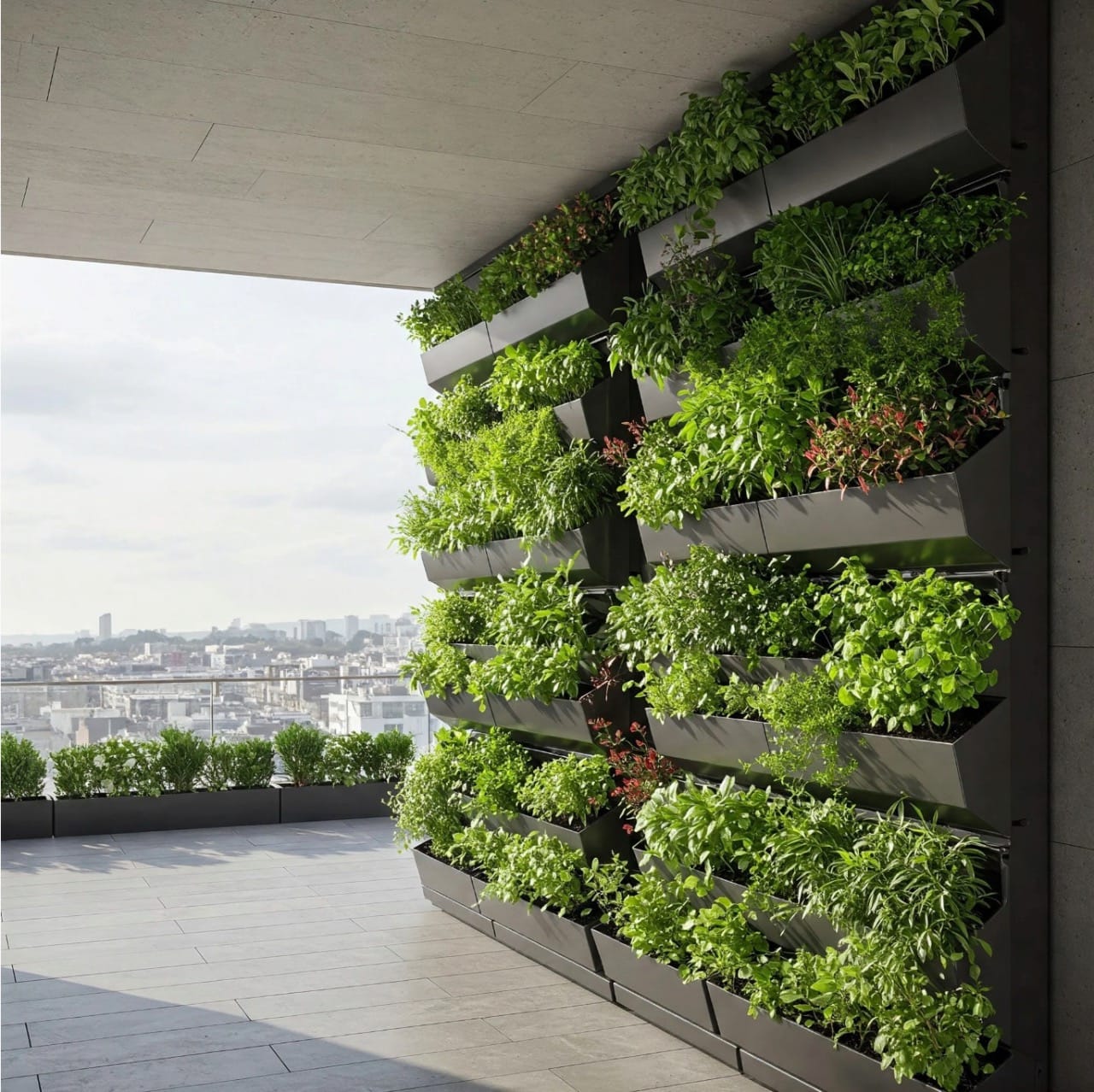 - 테라스에 녹지를 더하고 싶지만 공간이 부족하다면 수직 정원을 활용할 수 있다는 정보를 얻었다. 옹벽에 화분을 걸거나, 장미나 덩굴식물을 위한 트렐리스를 설치하는 등 여러 가지 방법이 있을수 있다. 이런 수직 식재는 좁은 공간에서 색감과 질감을 살려주고, 각 테라스를 더 아늑하고 풍성하게 만든다. 오래된 나무 팔레트를 재활용해서 허브를 심는 수직 정원을 만들면 눈높이에서 바질이나 민트 같은 허브를 바로 따서 쓸 수 있을듯. 게다가 수직 식재는 아래쪽 테라스에 자연스럽게 그늘을 만들어주며, 햇빛을 막아주고 프라이버시도 확보될 수 있다. 꼭 화려한 그린월이 아니더라도 간단한 걸이 화분 등 다양한 수직 구조를 활용하면 계단형 공간의 매력을 더 높일 수 있다.