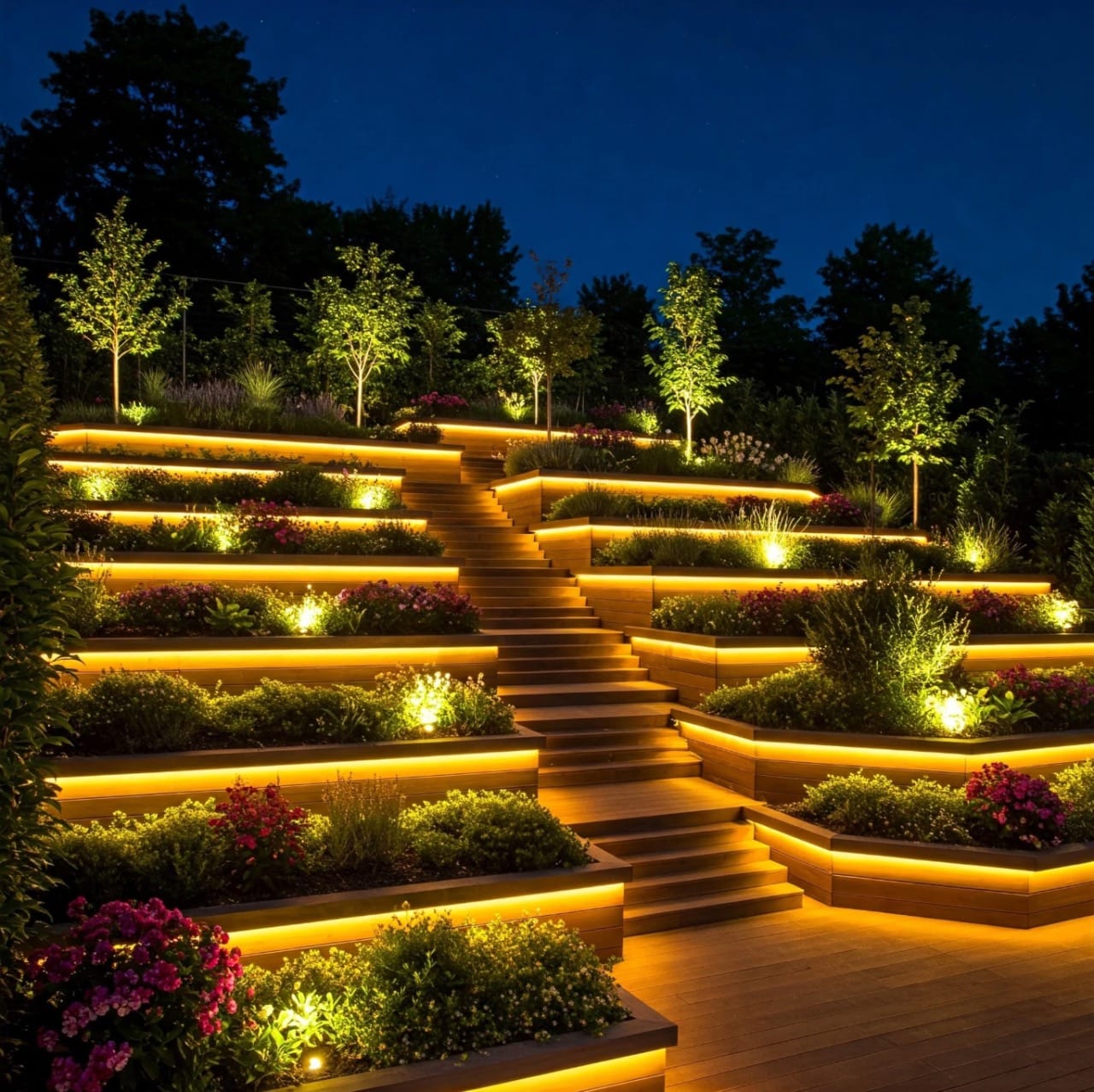 - 테라스 정원이 낮에만 예쁜 건 아니다. 해가 지고 나면 조명 덕분에 분위기가 완전히 달라질 수 있다. 계단마다 태양광 랜턴 하나씩 두면, 밤에도 길이 환하게 보이고 오르내릴 때 기분도 좋아진다. 휴식 공간에는 줄 조명을 달아서 별빛처럼 아늑하게 꾸밀 수 있고, 스포트라이트로 멋진 식물이나 작은 연못을 더 빛나게 할 수도 있다. 만약 멋진 나무나 키 큰 관목이 있으면 업라이트를 켜서 밤하늘을 배경으로 살아 있는 작품처럼 만들 수 있다. 옹벽 끝에 LED 바를 살짝 숨기면 미래 공간 같은 느낌도 난다. 딱 좋은 밝기로 안전하게 오갈 수 있게 해주면서, 밤에는 테라스가 신비로운 분위기로 변하는 것이 진짜 매력이다. 그리고 '모기' 등의 해충을 어떻게 구제할지도 적극 고려해야 한다. 진심으로. 모기 등의 해충은 자연적이며, 자연은 무자비하다.